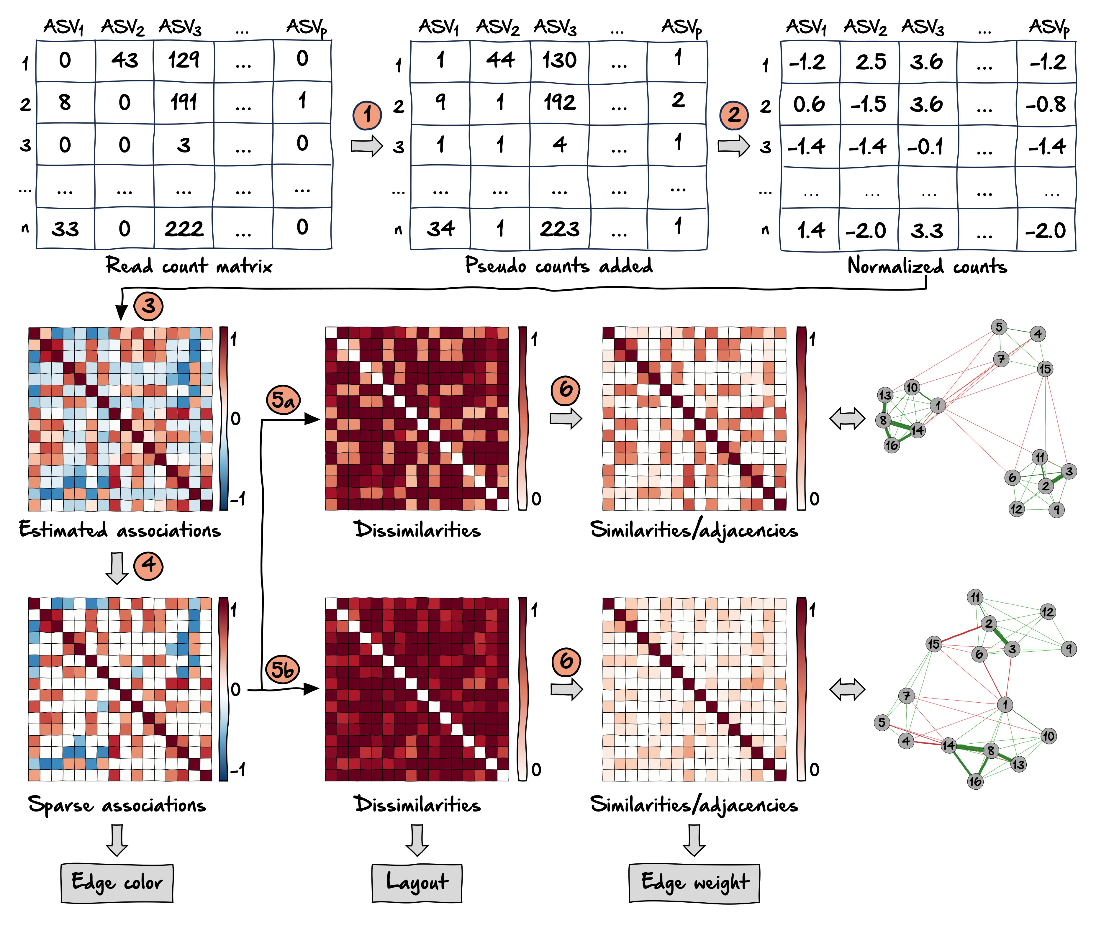 The figure below shows the workflow for learning/constructing a microbial association network as proposed by Peschel et al. (2021). The respective steps are explained below.