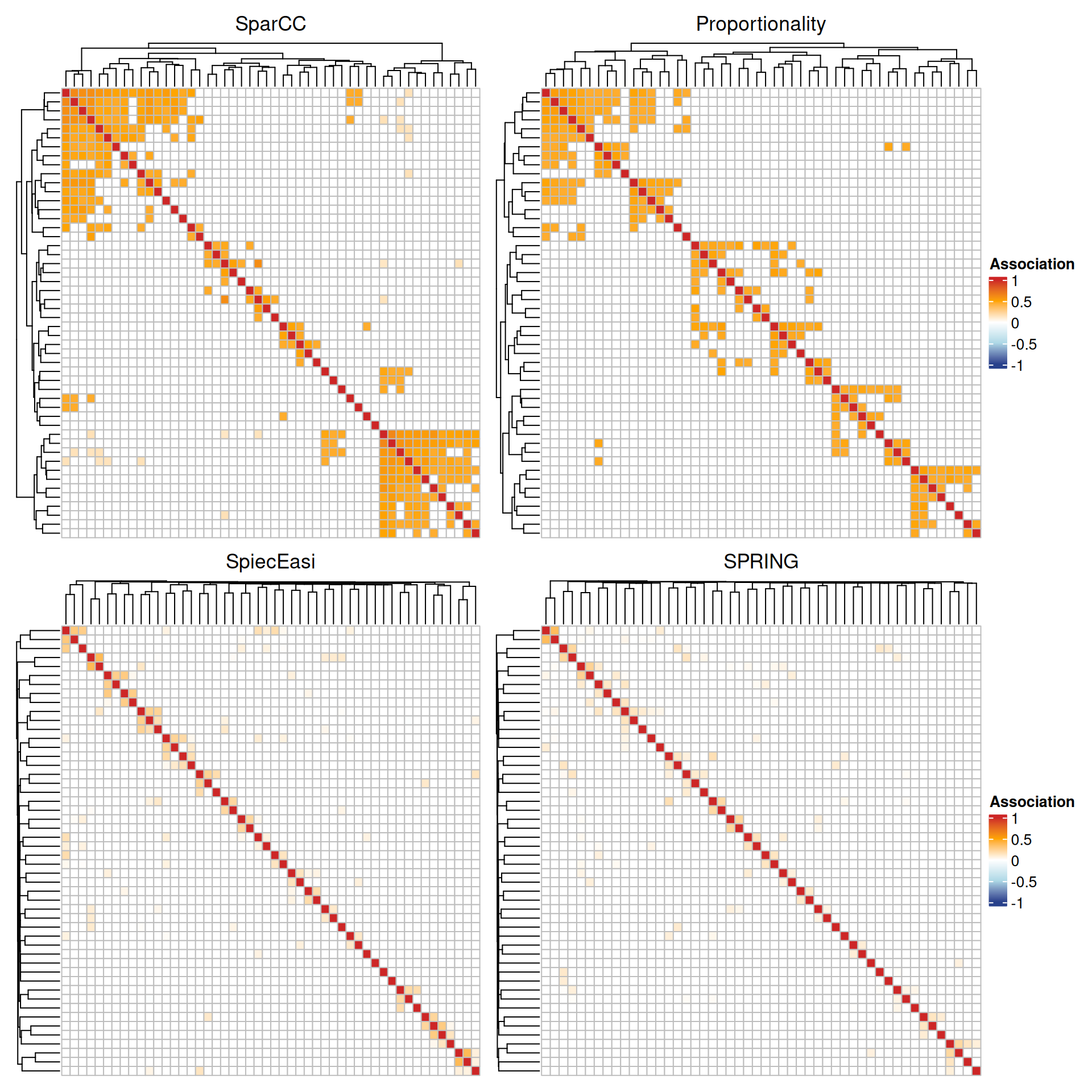 - SparCC (implemented in SpiecEasi); applied in Section 1.7.1