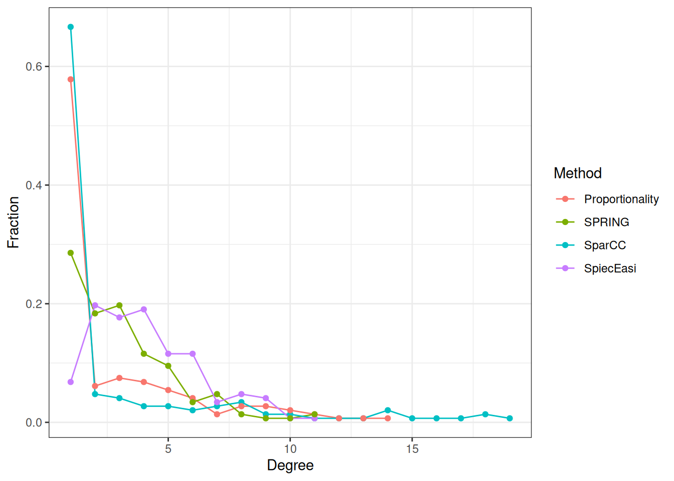 The SparCC and shrinkage proportionality networks have a considerably higher proportion of singletons (zero-degree nodes) than the two conditional dependency graphs, but a lower proportion of nodes with degrees between one and five. The SpiecEasi and SPRING graphs, on the other hand, have a higher proportion of low degree nodes, but no highly connected nodes with a degree greater than eleven.
