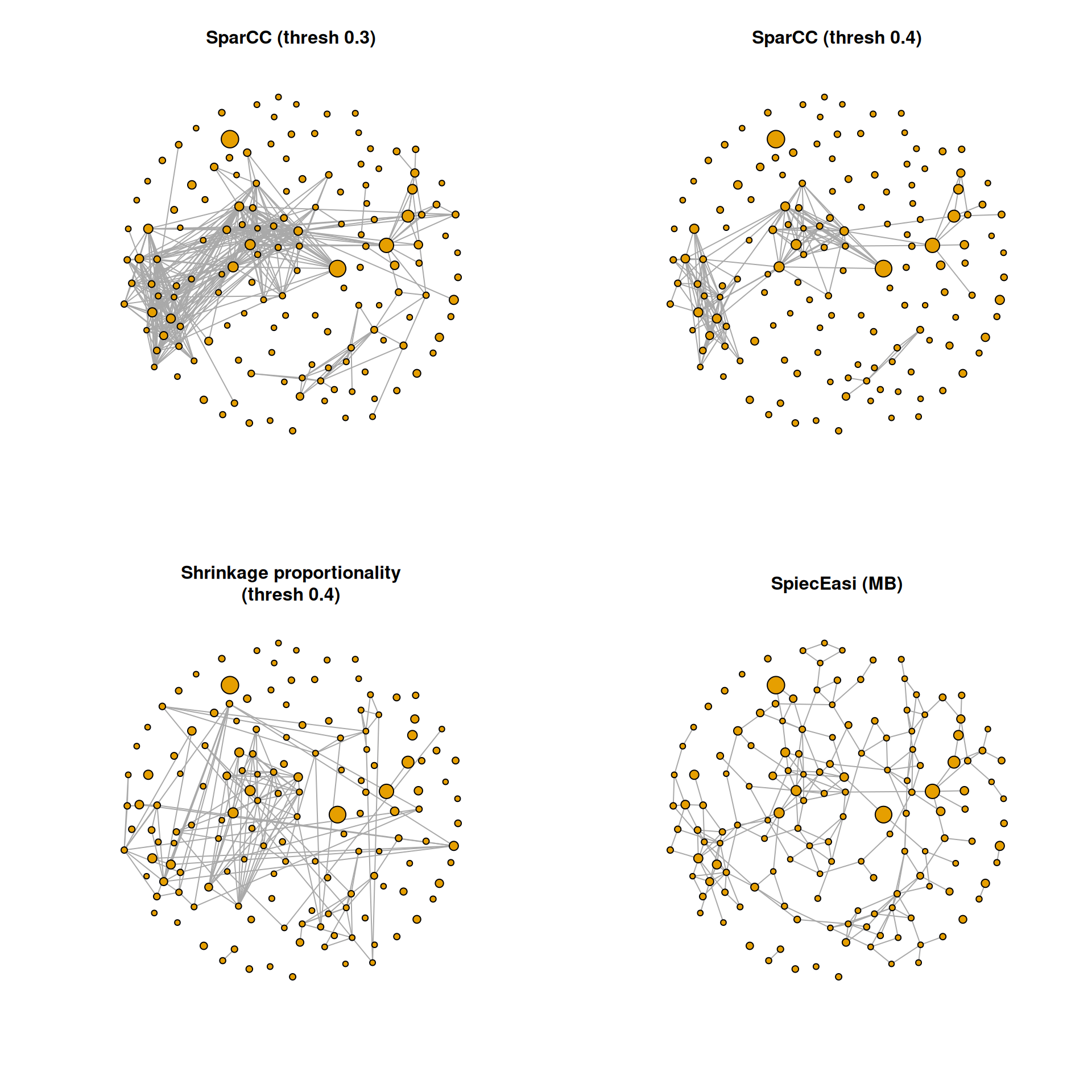 A few observations: The density of SparCC (threshold 0.4), proportionality and SpiecEasi is comparable, while the SparCC correlation network with threshold 0.3 is much denser. However, there are edges in the proportionality and SpiecEasi networks that are not present in the two SparCC networks. The SpiecEasi network has less highly connected nodes than the other three networks, but more nodes with one or two connections.