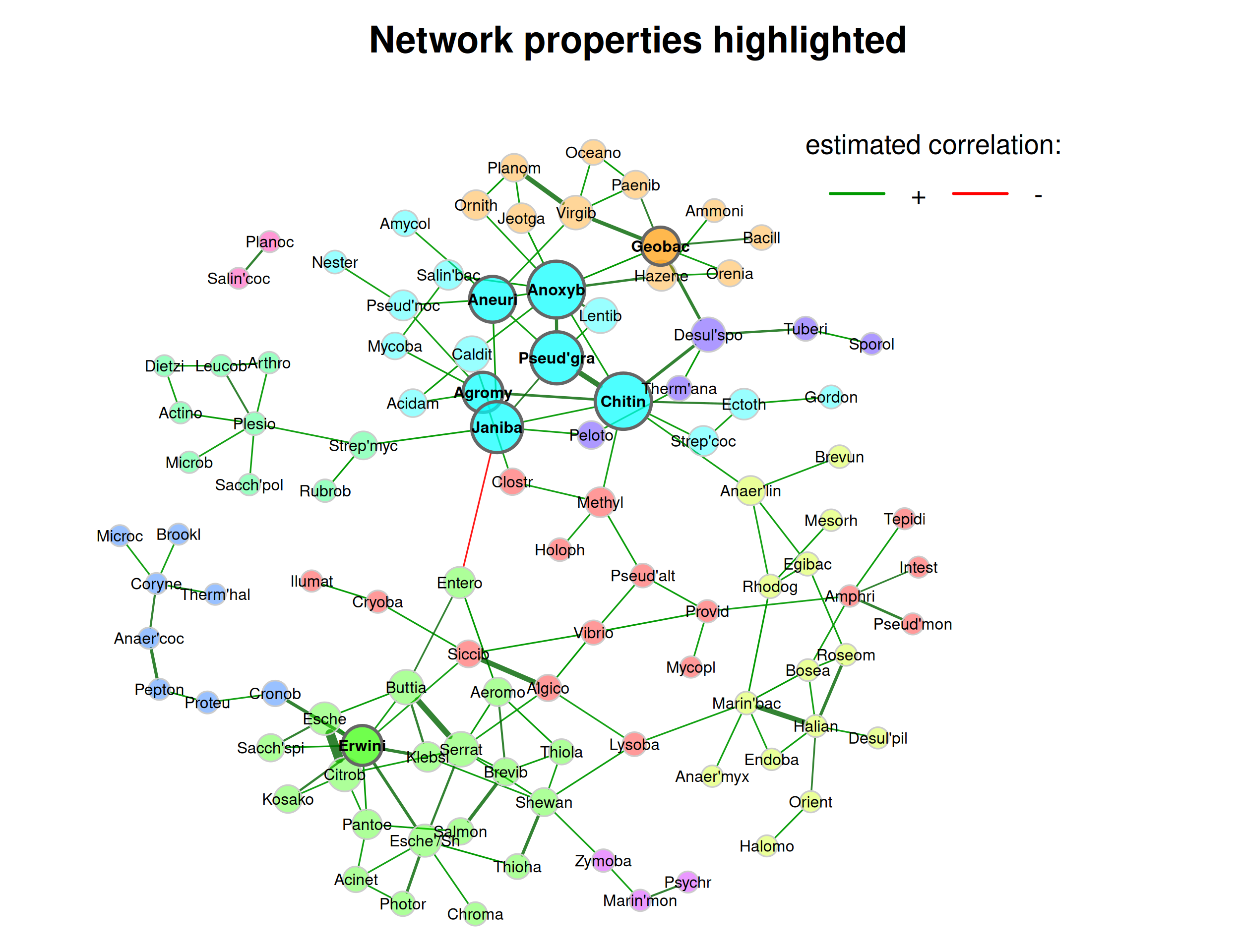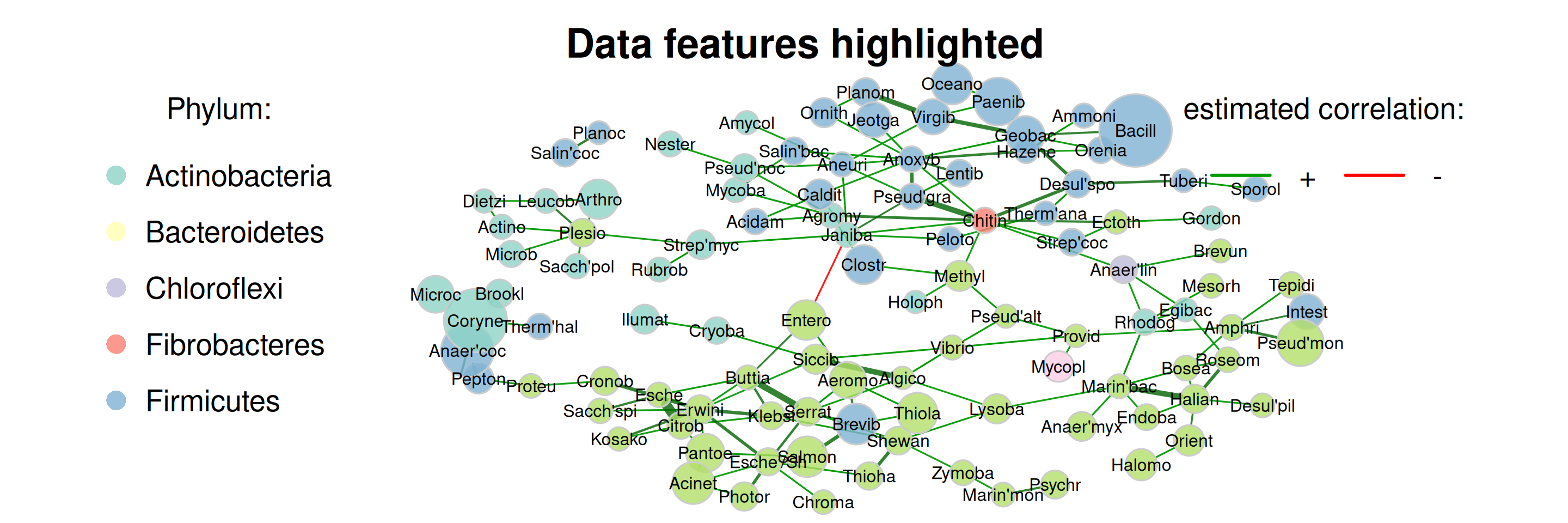 As third example, we use the SpiecEasi (“Sparse InversE Covariance estimation for Ecological Association and Statistical Inference”) approach proposed by Kurtz et al. (2015) to estimate a sparse conditional dependency graph. The neighborhood selection method (“MB”) introduced by Meinshausen and Bühlmann (2006) is used for network learning. The approach is implemented in the R package SpiecEasi.