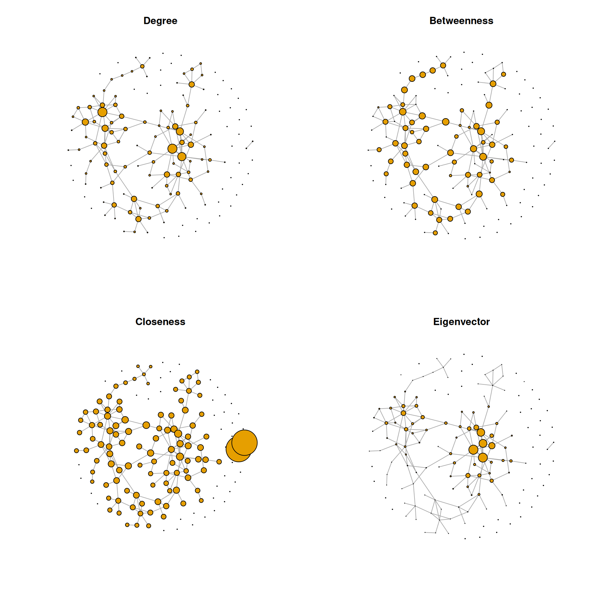 The graph objects can now be plotted using the igraph package. The same layout is used in all four plots so that the networks are comparable.