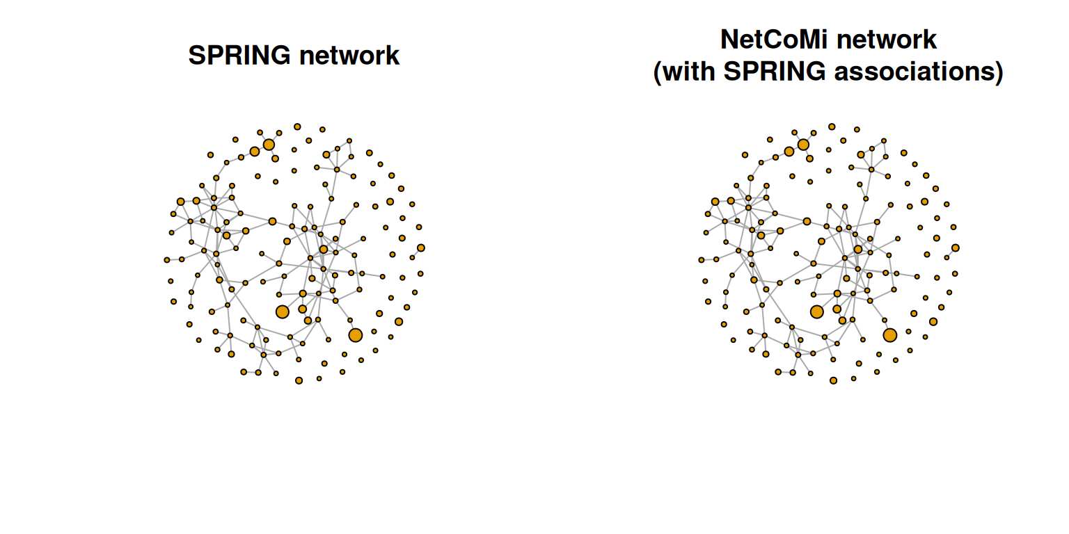 The main association measure used in this chapter is the SPRING (“Semi-Parametric Rank-based approach for INference in Graphical model”) method proposed by Yoon, Gaynanova, and Müller (2019). SPRING learns conditional dependency graphs for compositional data and follows the neighborhood selection method introduced by Meinshausen and Bühlmann (2006) (“MB”). We will show how to apply the method directly, as well as how to use it in conjunction with the R package NetCoMi, which is specifically designed for the construction and analysis of networks for microbiome data.