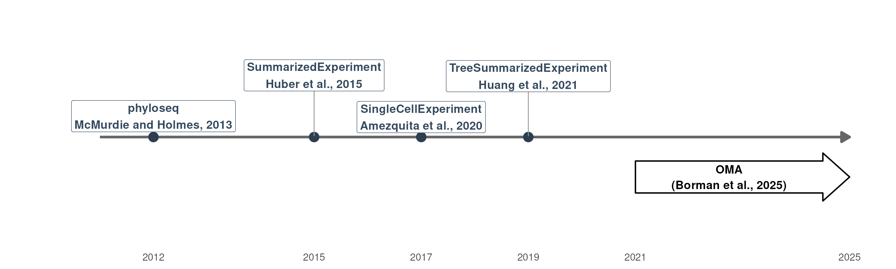 Over the years, several approaches to data organization have been developed. One of the first widely adopted data containers in microbiome research was phyloseq (McMurdie and Holmes 2013), designed for 16S amplicon sequencing data. However, it has limitations, particularly in linking multiple experiments and ensuring interoperability between tools in Bioconductor.
