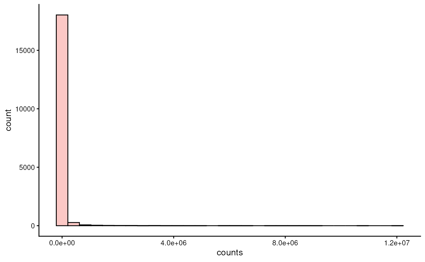 Microbiome data is typically zero-inflated, meaning that there are lots of unobserved features. Let’s first visualize the distribution of counts.