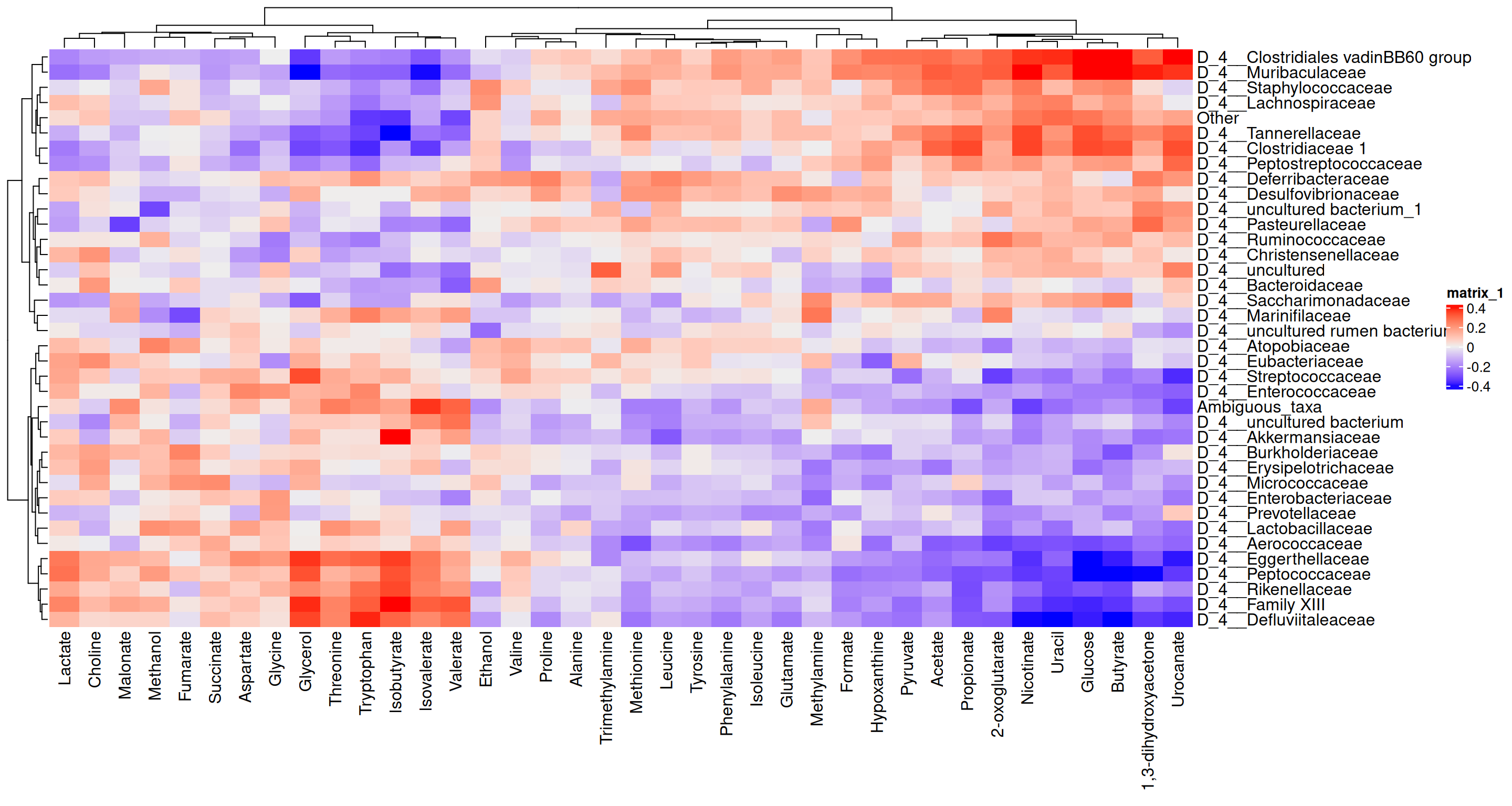 library(mia)# Import data and renamedata("HintikkaXOData")mae <- HintikkaXOData# Agglomerate rare taxa by prevalence at the Family level & log10-transform read countsmae[["microbiota"]] <-agglomerateByPrevalence(mae[["microbiota"]], rank ="Family")mae[["microbiota"]] <-transformAssay(mae[["microbiota"]], method ="clr", pseudocount =1)# Get cross-correlation between taxa & metabolitesx <-testExperimentCrossAssociation(mae, experiment1 ="microbiota", experiment2 ="metabolites",assay.type1 ="clr", assay.type2 ="nmr",mode ="matrix", sort =TRUE)$cor# Visualize taxa-metabolite associations on heatmapComplexHeatmap::Heatmap(x)